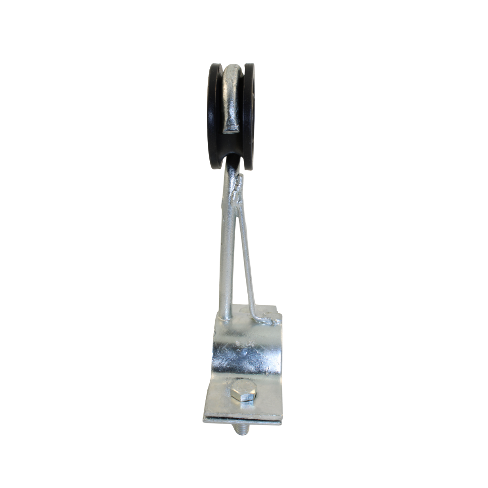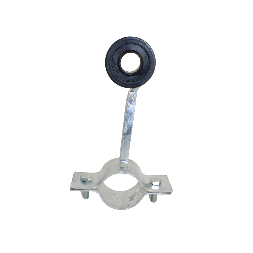 Característica: Composta por uma abraçadeira bipartida de 2″ que envolve o mastro, conectada por uma haste metálica a um anel isolante de polímero. Diferente da abraçadeira de interligação (que faz contato elétrico), esta versão serve apenas para conduzir e sustentar o cabo sem permitir o contato direto com o mastro.
