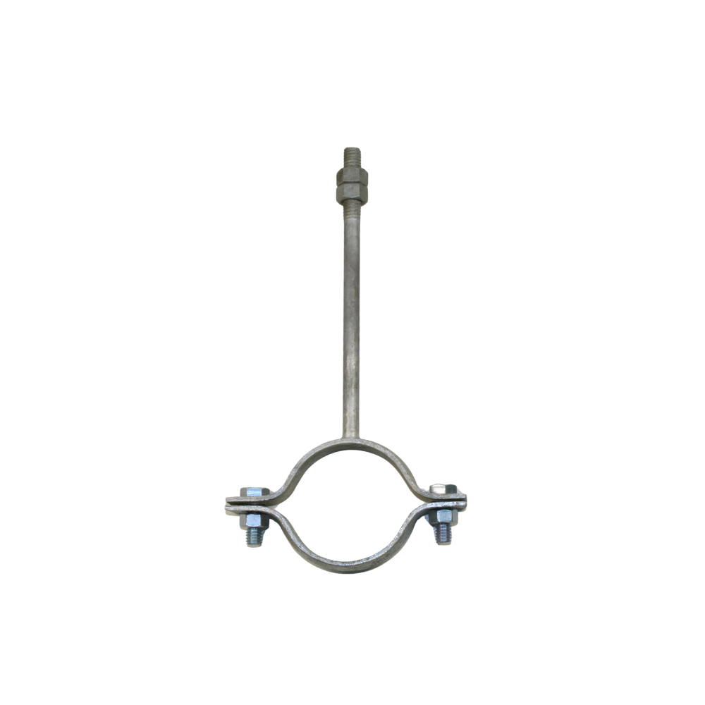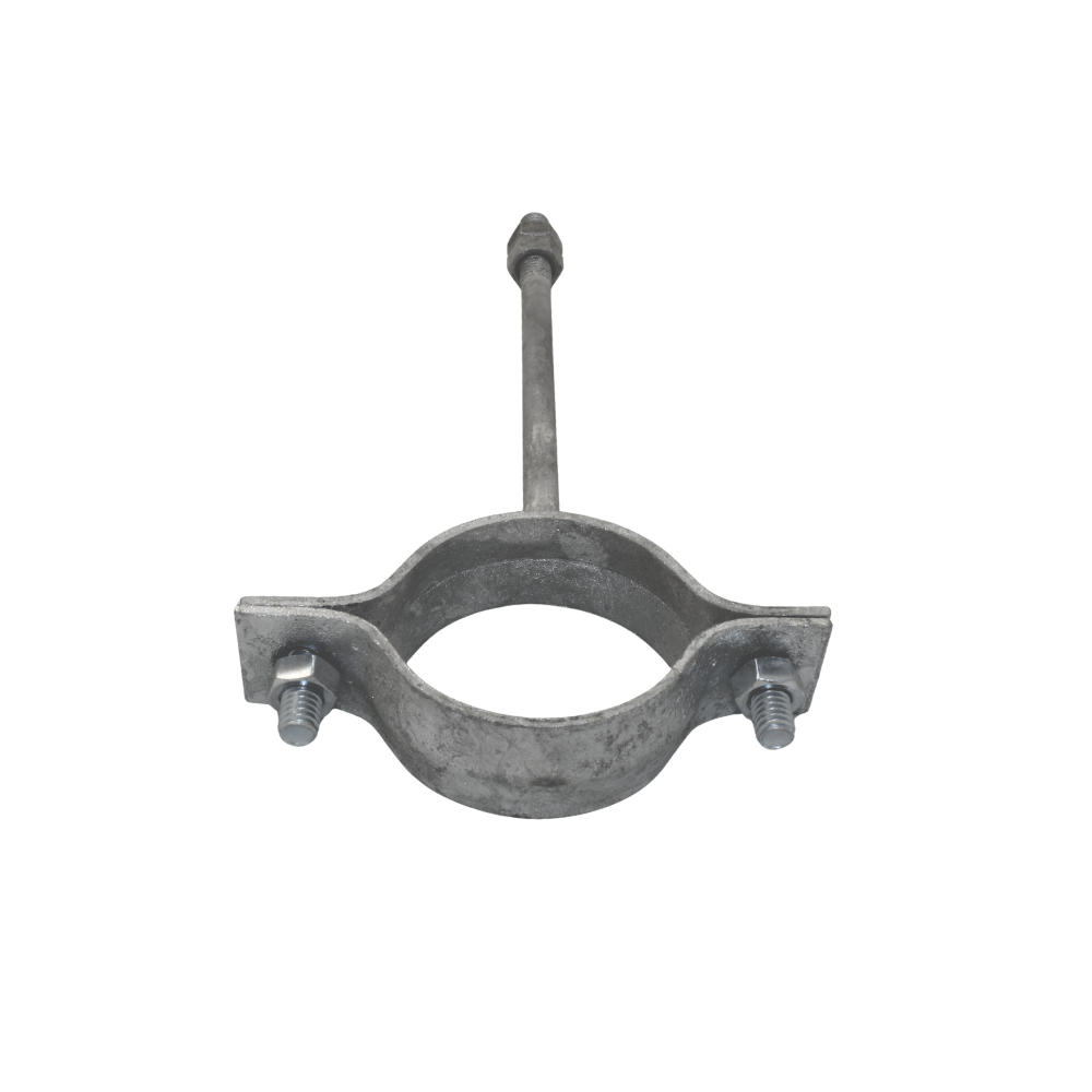 Característica: Diferente dos modelos com base plana, esta versão possui uma haste curta ou parafuso com rosca mecânica integrada. Isso permite que a abraçadeira seja rosqueada diretamente em buchas metálicas, suportes de fixação em torres ou atravessada em chapas e travada com porcas.