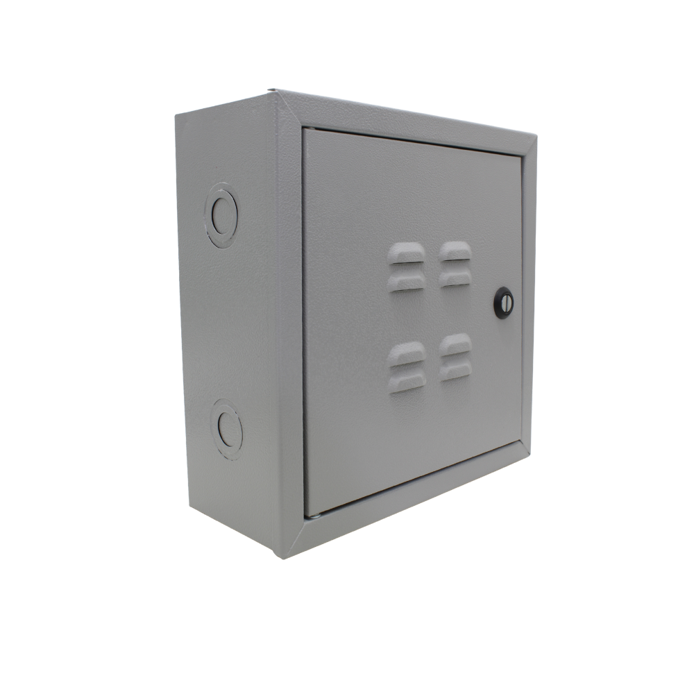 Característica: Modelo de sobrepor com dimensões de 20 x 20 cm. Possui porta com fecho fenda e venezianas para ventilação. Internamente, abriga um barramento de cobre com 5 terminais, permitindo conexões seguras sem a necessidade de terminais extras nos cabos.