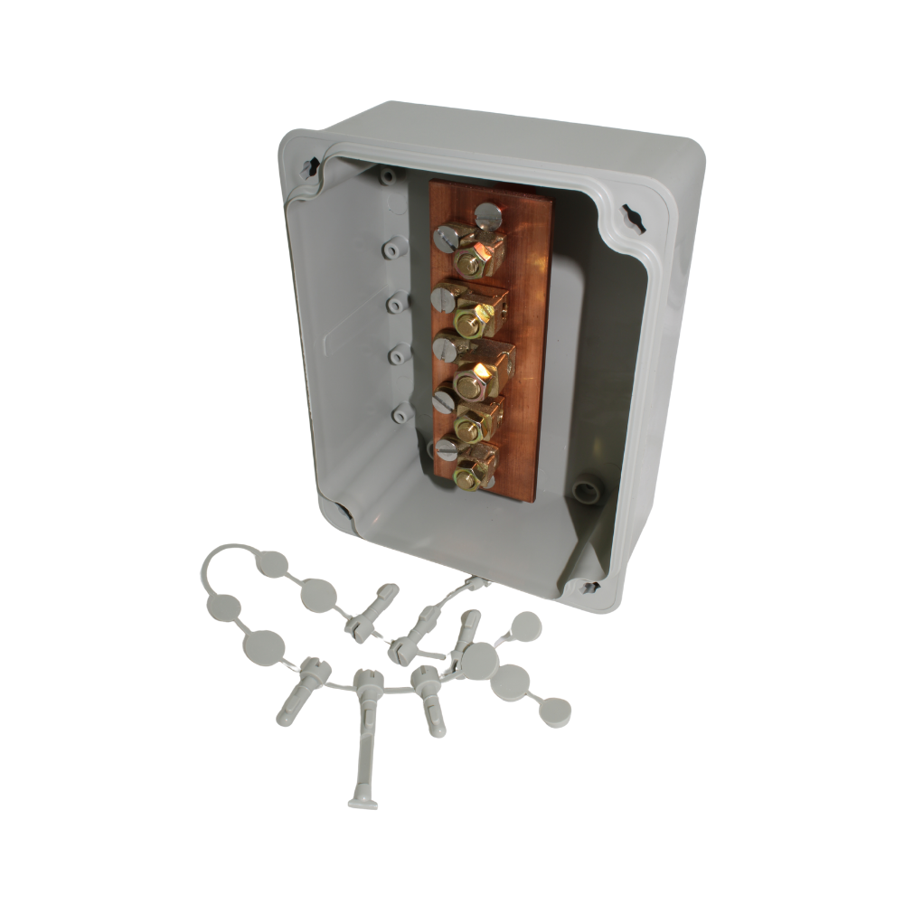 Material: Caixa fabricada em PVC rígido (isolante e resistente à corrosão) com tampa. O barramento interno é feito de cobre eletrolítico de alta condutividade, montado sobre isoladores, com parafusos e conectores em liga de cobre zincado ou latão.