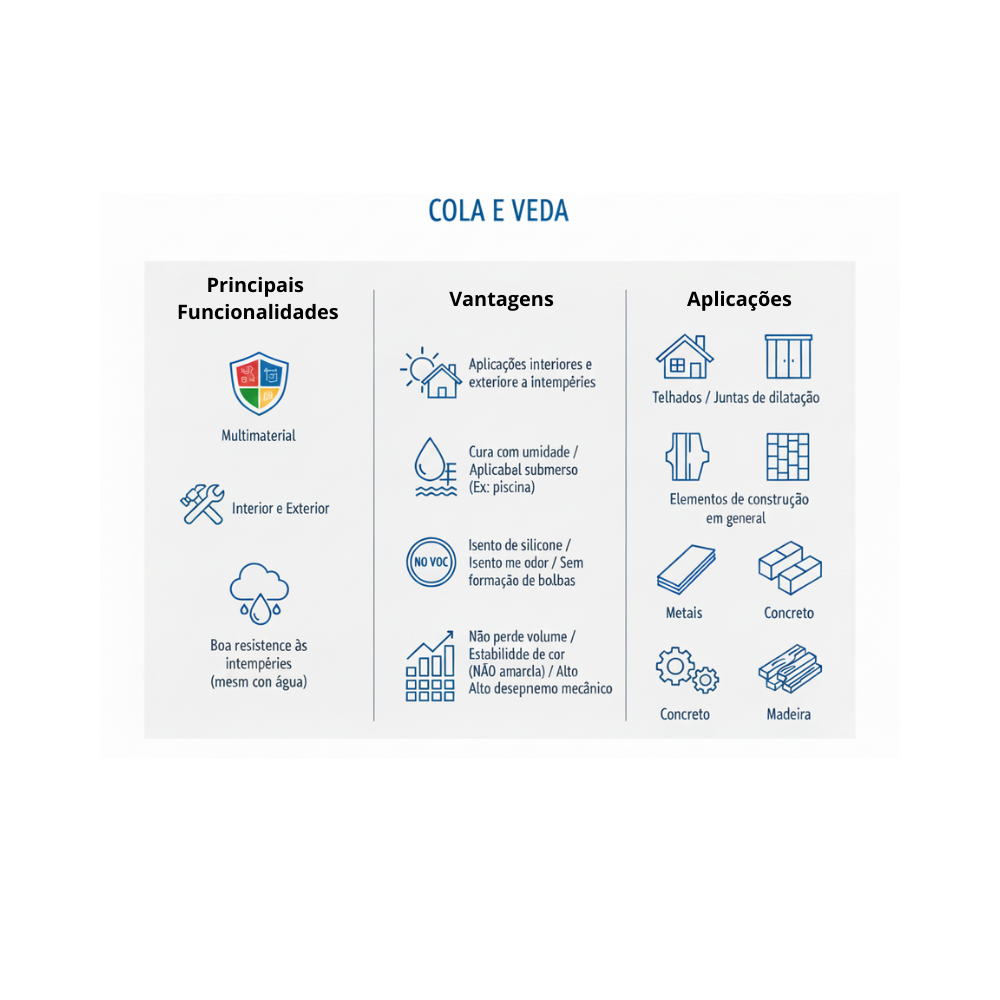 Característica: Trata-se de um adesivo à base de Polímero MS com tecnologia “High Tack”. Sua principal característica é a colagem inicial extraforte (pega imediata), que evita que a peça escorregue durante a aplicação, mesmo em superfícies verticais.