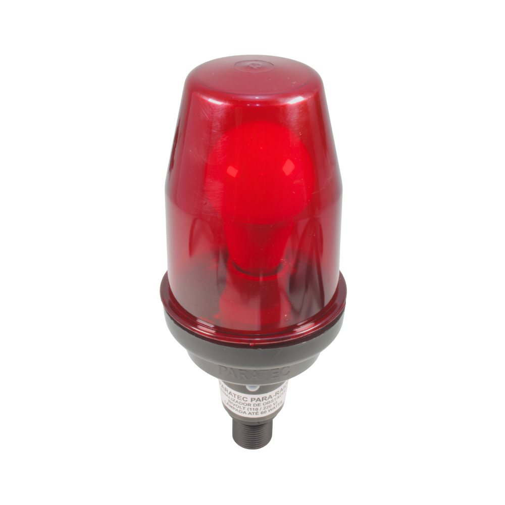 Material: Cúpula em policarbonato vermelho com proteção UV e propriedades prismáticas para melhor dispersão da luz. A base é fabricada em material termoplástico de alta resistência ou alumínio, com rosca interna para fixação em eletrodutos e vedações que garantem o grau de proteção contra chuva e poeira.