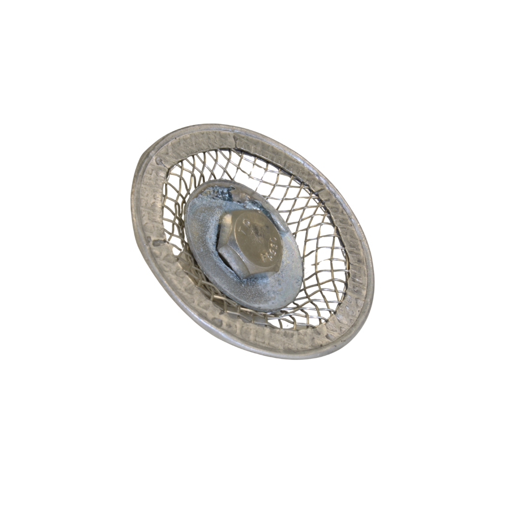 Características: Base circular de 45mm com malha integrada para ancoragem química, equipada com parafuso de 1/4″ e porca.